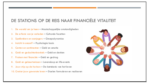 Tijdens onze tweedaagse opleiding doorloop je net als een klant de tien stappen uit het werkboek Onderweg naar duurzame financiële vitaliteit van Erna Knipscheer. Je ontdekt welke psychologische factoren meespelen bij financiële besluitvorming: omgeving, zelfbewustzijn, emoties, gedachten en geldgedrag.